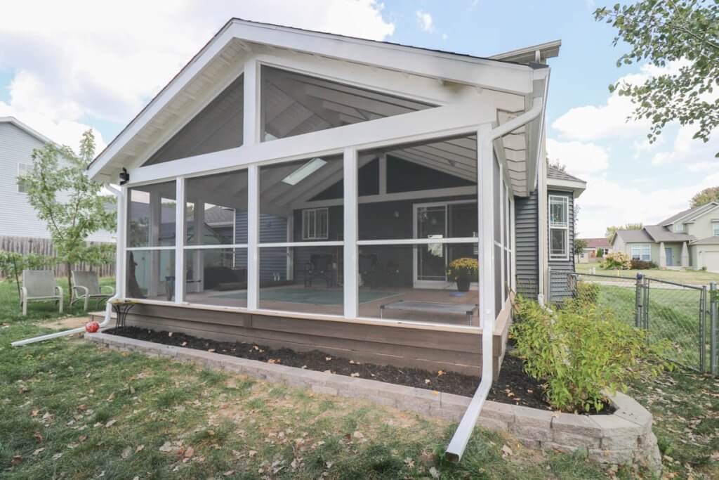 This sunroom addition completed in Holt, Michigan included demolition of the existing wood deck. The entirety of the deck structure was removed and replace with new posts and footing for the updated sunroom to bear the load of the new structure. The new decking was done with Trex Transcend Carmel with Trex Enhance Coastal Bluff fascia and skirting. The structure was covered with Azek wrap around the beams. The screen frames are an extruded white aluminum with a charcoal fiberglass screen mesh. We installed (4) Velux skylights to give extra light and installed remote controlled blinds to provide the ability to close and open based on the sunlight. We ran conduit for exterior lighting and a ceiling mounted fan along with a plug next to the screen door.