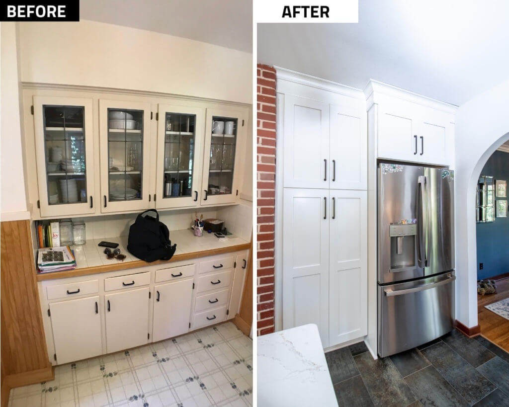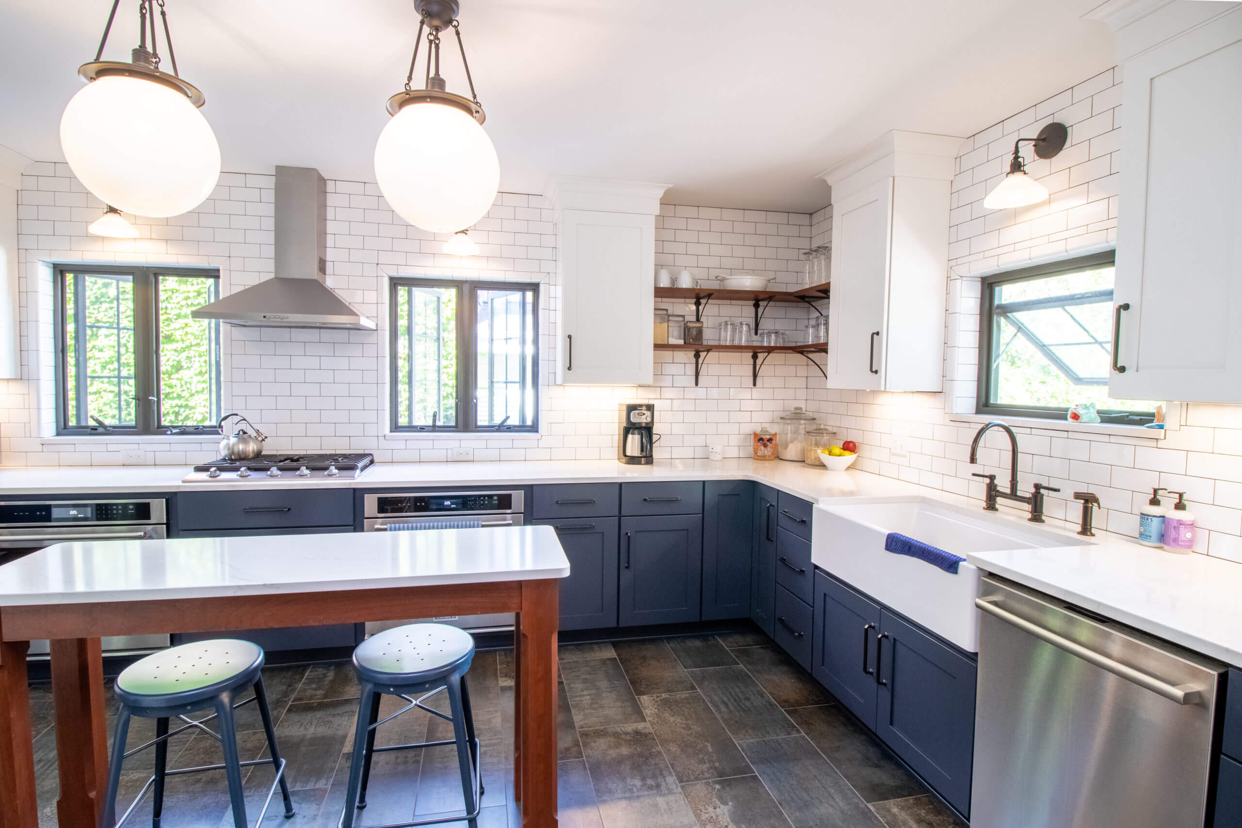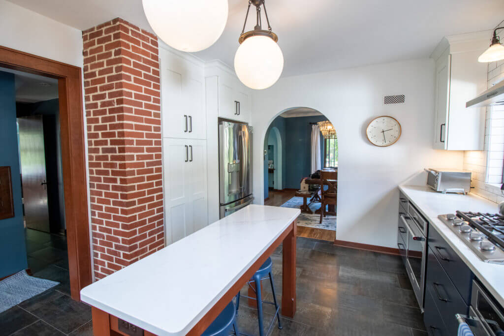 The homeowner wanted the kitchen to be updated and expanded in their forever home. They loved the location but wanted to make their very small kitchen more functional and more beautiful with a full remodel. This remodel of the kitchen incorporated using two separate rooms to create a larger kitchen. The goal was to create an island but the overall space did not allow for a traditional cabinet style island so a movable furniture island piece was designed. The use of the original chimney brick was a welcome aspect to incorporate into the new design as it was exposed.