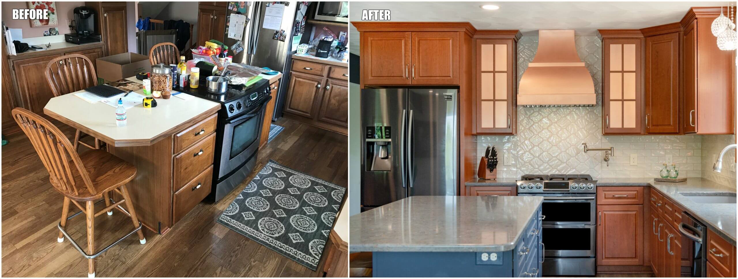 After living in their home for over 20 years, the customer decided it was time to update and remodel their original kitchen to create the kitchen of their dreams. Functionality and style were key in the layout of the new kitchen renovation. With the grandchildren now living close by, a central functional island was an important factor in the new layout. Opening up the wall between the kitchen and family room was also an important consideration. Full gut and remodel of the existing original kitchen. The copper range hood and color difference between the island cabinets and surrounding cabinets create some wonderful design elements. The textured backsplash tiles provide interest and beauty.