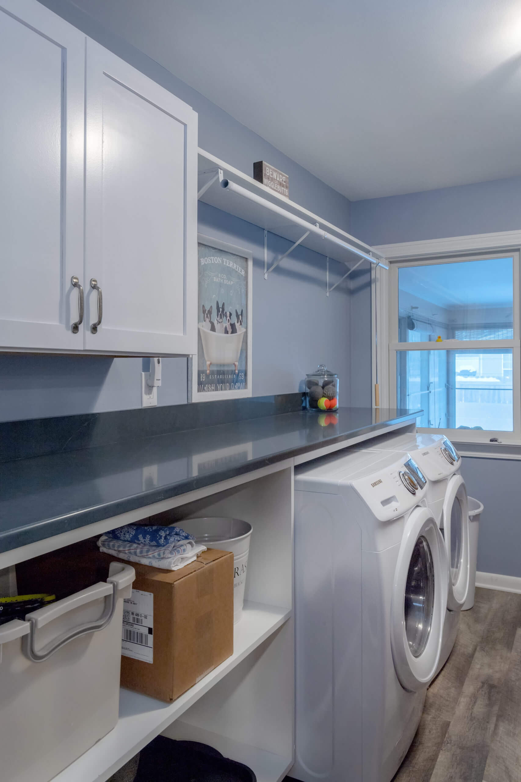 The customers wanted a major gut and remodel of their kitchen, dining area, laundry, and bathroom. The goal was to open up the kitchen and give it enough room for multiple people to be in the kitchen at the same time. The goal was to re-imagine each space to improve the look and function of each room. The end result is a beautiful transformation and it is hard to imagine the way it looked before! The kitchen was greatly expanded and opened up by adding a support beam. The large open area includes new flooring, cabinets, countertops, sink, faucet, updated recessed can lighting. The laundry was moved from the basement to the main floor with a reconfiguration to the room. A double french-door was closed up to allow for more storage space and a better flow. The master bathroom was also gutted and remodeled as part of their full remodel project.