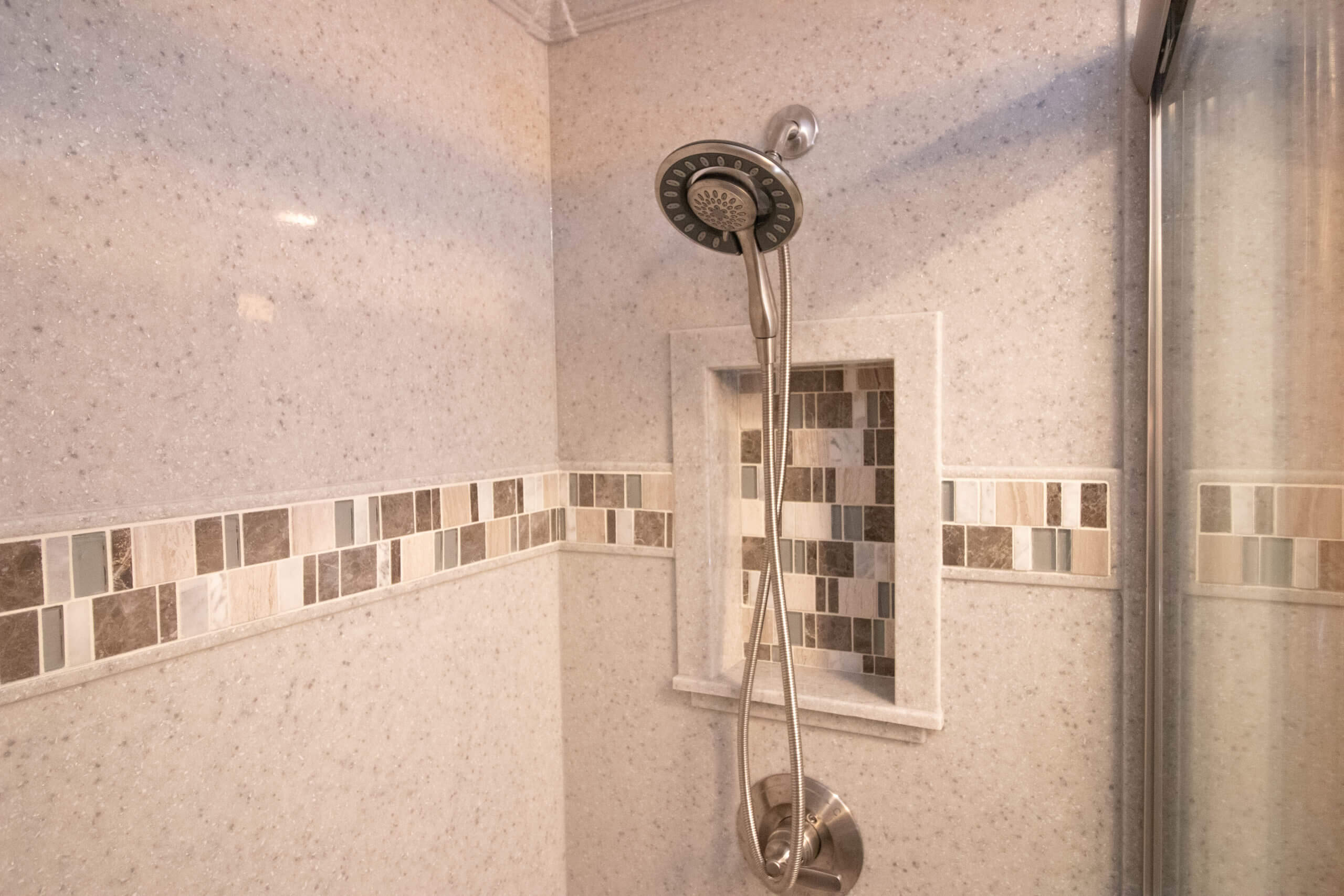 Update to the layout in the kitchen by adding an island and improving on the storage space and function. Move a wall to allow a shower to be added to the main floor half bath to convert to a full bathroom. Full gut and demolition of existing kitchen with new cabinets and layout. Update to electrical and plumbing for new layout. New flooring, drywall patching and painting, new quartz countertop, undermount sink, new vanity cabinet, mirror, tile and wall panel shower surround, bypass glass sliding door, new faucet and plumbing fixtures, new recessed LED lighting, added pendant lighting at new island.