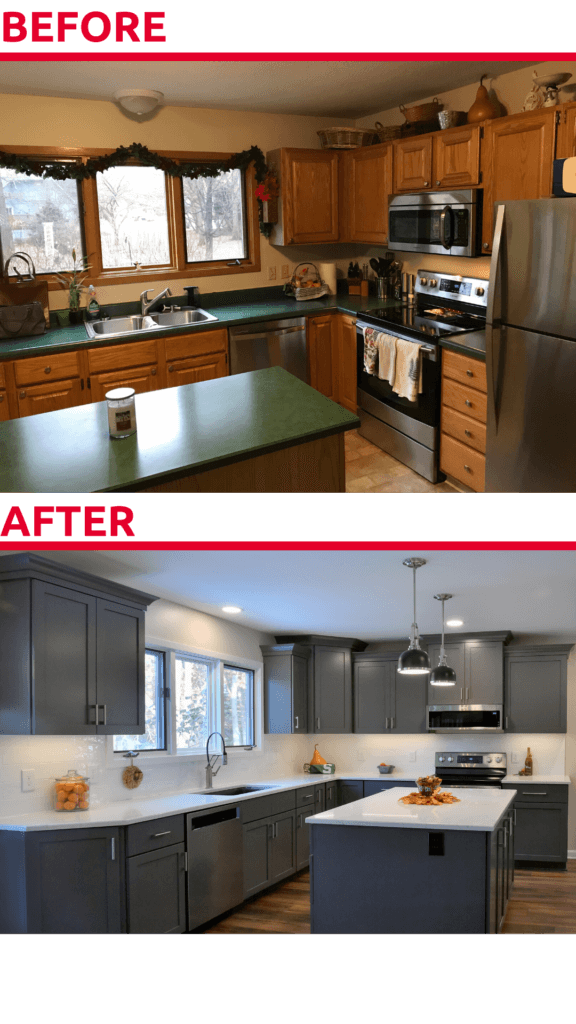 - Modernize the kitchen with new semi-custom kitchen cabinets.