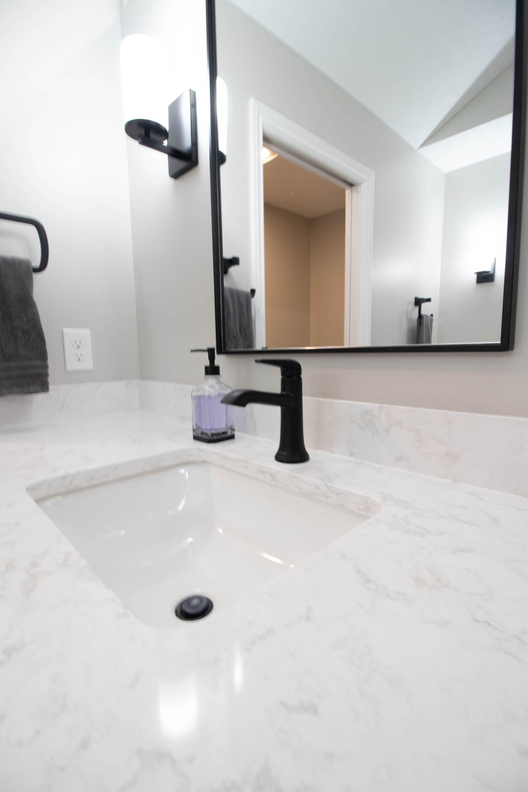 Full overhaul of the master bathroom. The existing layout of their bathroom was in need of a change with the tub taking up most of the room. The tub was no longer desired and the existing shower had cracking in the tiles and felt really dark in the corner. The existing bathtub was removed and space was examined to see ways to improve storage, have a much bigger shower, and to move the vanity that was in the "foyer" area to be inside the bathroom to create a changing space in the foyer area. With the removal of the large bathtub, the space became open to create a large shower with dual vanities. The large tile shower with the 3/4 wall gave space for a large recessed tile niche and the control for the shower was at the opening so that the shower control could be done without walking to the showerhead side.